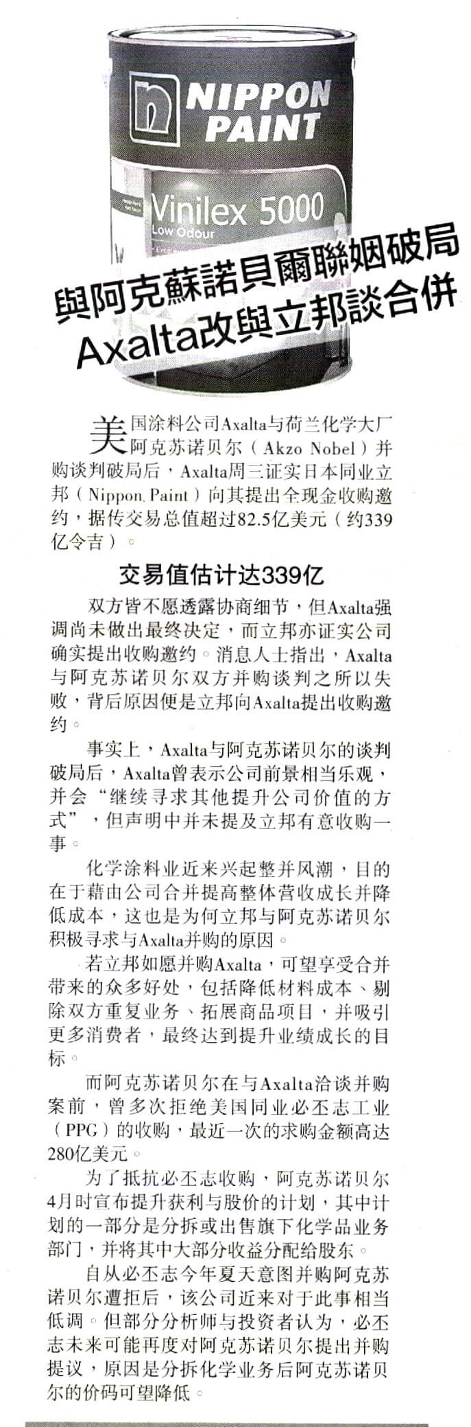 24 Nov, 2017 Sin Chew Daily Akzo nobel terminates merger plan with Axalta; Axalta changes to discuss with Nippon Paint instead